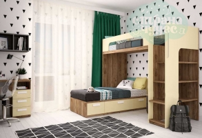 Помещение делится на учебную и игровую части, а также зону отдыха. Всем известно, что дети любят лазить по лестницам, смотреть на окружающий мир с высоты (в прямом и переносном смысле), хорошим решением зоны отдыха может быть двухъярусная кровать. При этом освобождается место для размещения стола или игровой зоны. В детской для хорошего физического развития желательно иметь спортивный комплекс.