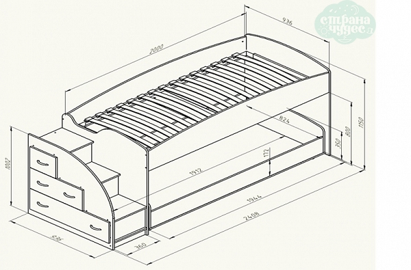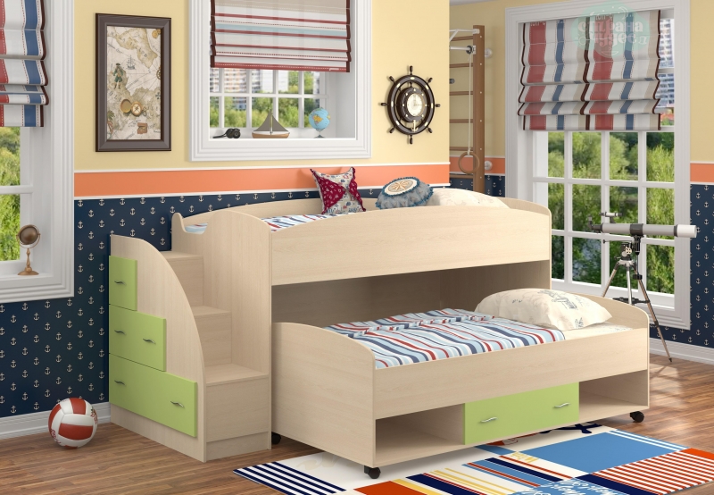 • нижняя кровать снабжена колесиками, 2 полками и 1 ящиком