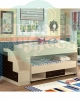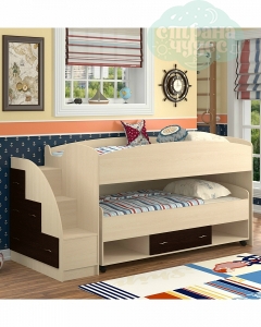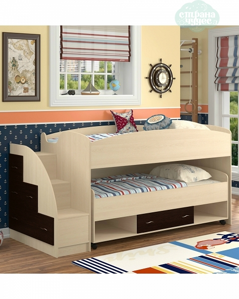 Кровать двухъярусная выдвижная Дюймовочка-4.3 беленый дуб Формула мебели - оригинальная модель, выделяющаяся на фоне других кроватей данного сегмента. Представляет собой невысокую конструкцию с двумя спальными местами и широкой лестницей, в торце которой помещены бельевые ящики. Основное преимущество Дюймовочки 4.3 - незначительная высота, на которой находится второй ярус, что делает ее безопасной для малышей от трех лет. Кроме того, нижний ярус снабжен полками и ящиком, и является полноценной кроватью, которую можно выдвигать из ниши и располагать отдельно. Мебель изготовлена из прочного ламинированного ДСП, устойчивого к ультрафиолету, влаге и механическим воздействиям, и покрыта по кромкам ПВХ, который сглаживает острые поверхности и препятствует проникновению воды в не ламинированную часть плиты.