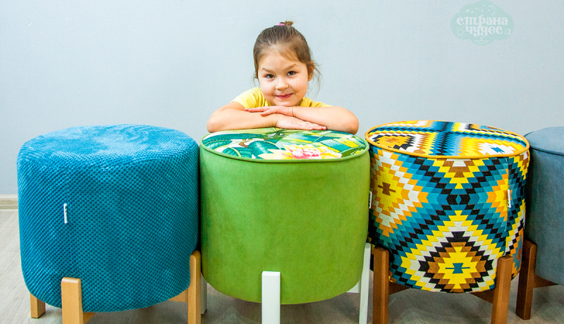 Обивка пуфа, в зависимости от выбранной расцветки, выполнена в мебельной ткани различных типов: плюш, велюр, гобелен, рогожка.